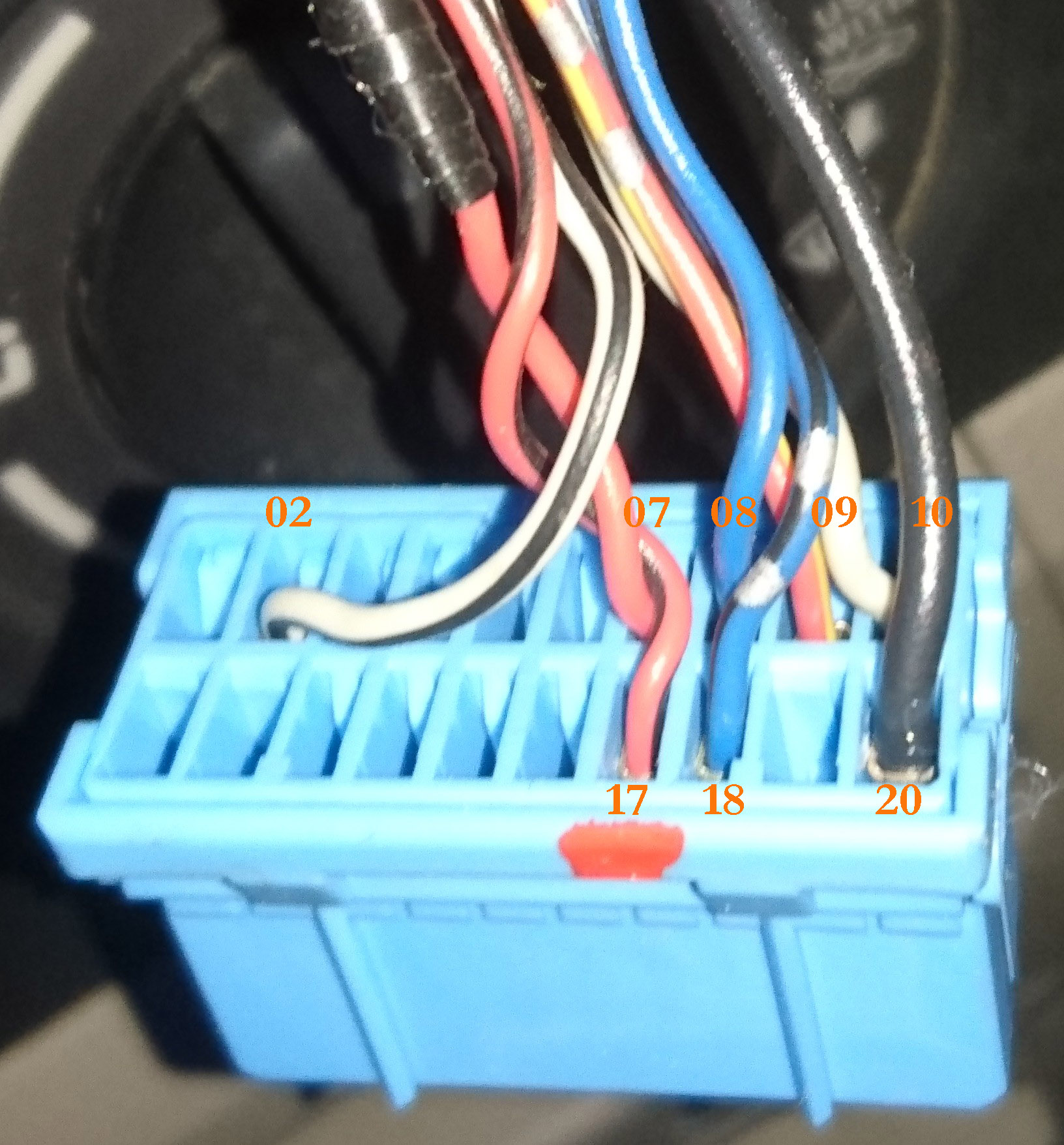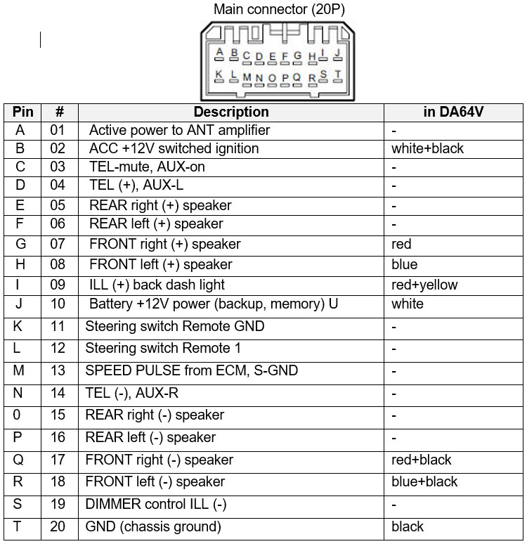 Has 4 jacks: Antenna (02-pin); CD-changer (14-pin) ; TEL/AUX (08-pin); and main speakers+power: 20-pin