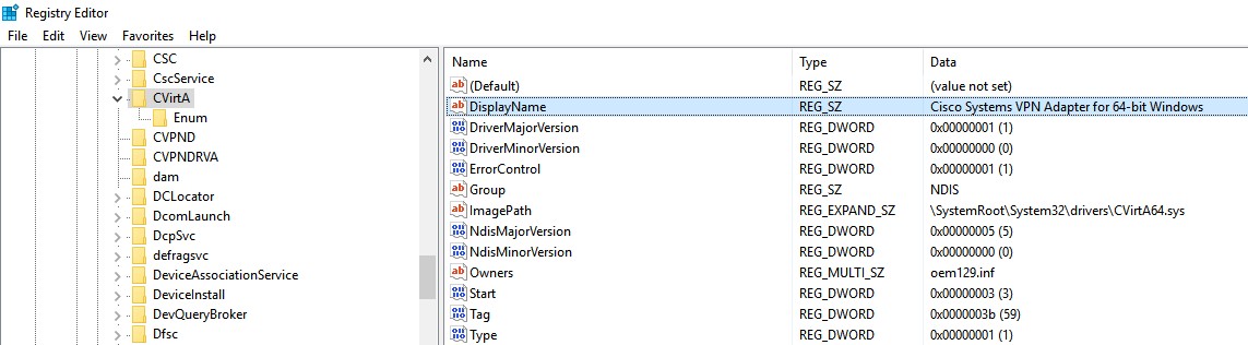 regedit.exe -> HKEY_LOCAL_MACHINE\SYSTEM\CurrentControlSet\Services\CVirtA, DisplayName -> Cisco Systems VPN Adapter for 64-bit Windows
