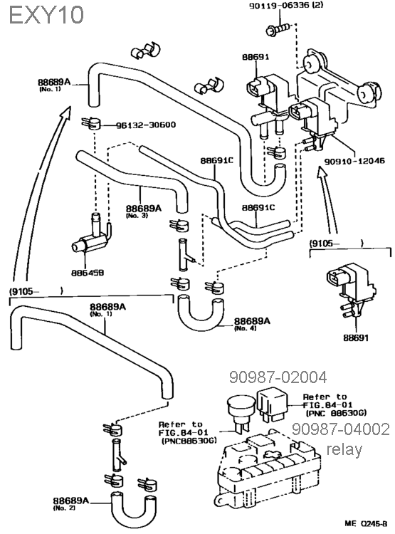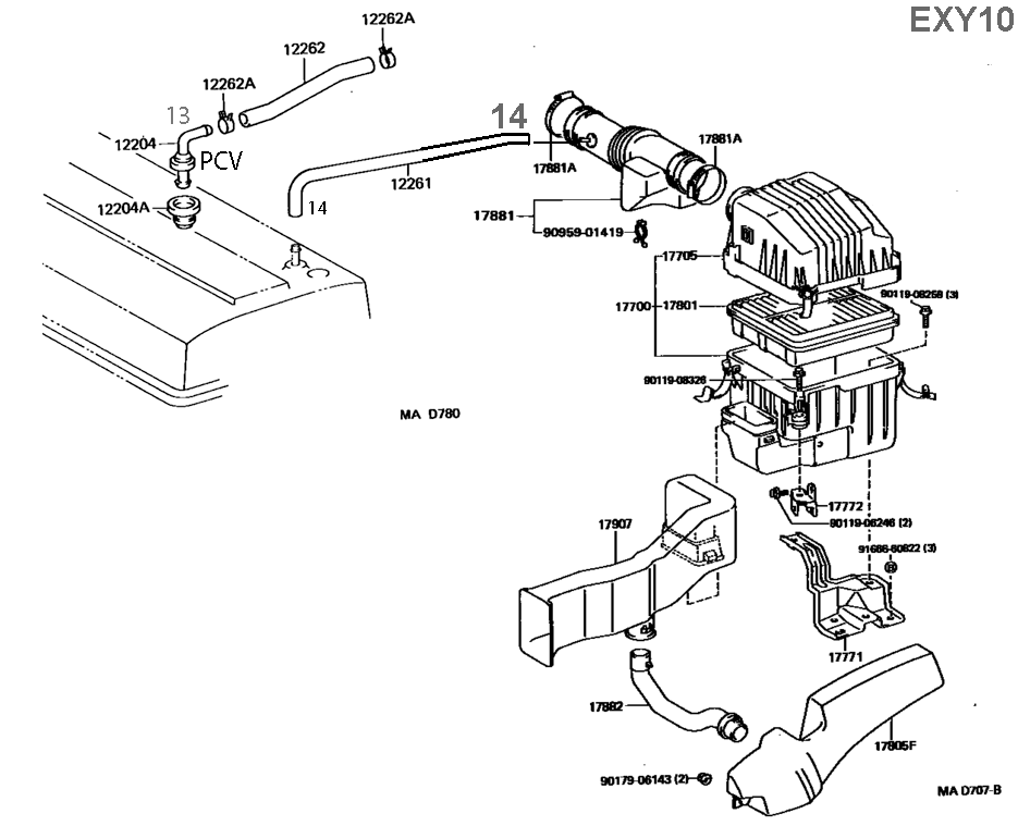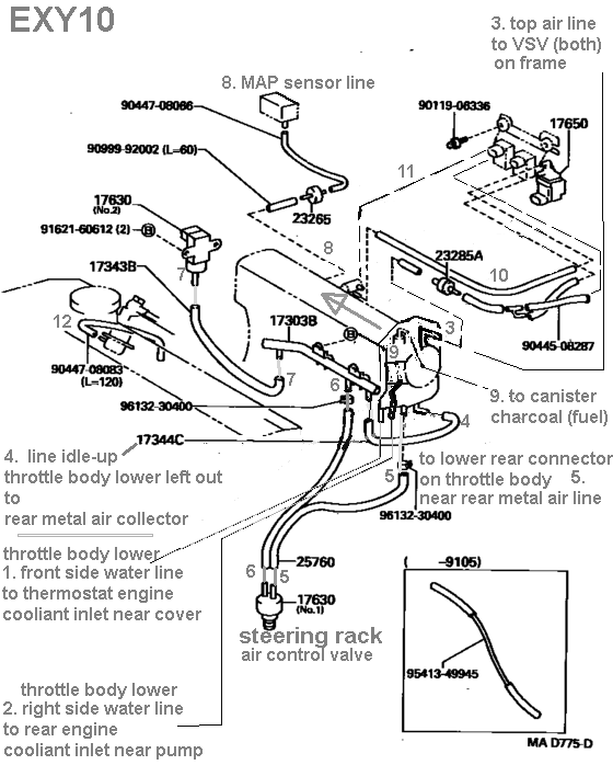 Throttle body has connectors (in addition to central huge input and output): Bottom: 1. Anti-freeze hose from thermostat 2. Anti-freeze hose to liquid cooler (water) pump 4. Air hose to metal commuter (mini manifold rear of intake manifold) 5. Air hose to control valve on steering rack Top: 3. thick hose to vacuum switching valves (pair), with intermediate round gas filter 9. thin hose from charcoal canister adsorber - intake of gas air petrol mix (since 1991-05 in SERA03 with gas filter, before - direct plastic pipe) 9.1. For SERA03 one more VSV added to adsorber canister hose /90910-12121, SERA01 has direct thin plastic pipe from throttle to adsorber charcoal canister Intake manifold has extra pipes: 8. out to MAP (manifold air pressure) sensor with gas filter on pipe d=4mm 10. splitted with 11. rear middle dual input from VSV (both) 12. input from fuel bypass valve (petrol return and pressure regulator) to cylinder one bypass hose is 7.5mm * 14.5mm * L=300mm 13. crankcase ventilation middle hose (with valve on cam cover) to intake manifold (managed by PCV=positive crankcase ventilation valve) 15. rear vacuum hose to brakes 16. right side outlet to electric idle valve, hose goes to metal commuter pipe Air bypass way for cam ventilation: 14 . hose from cam cover left side to filtered air flexible huge hose before throttle , used to take clean air into cam |