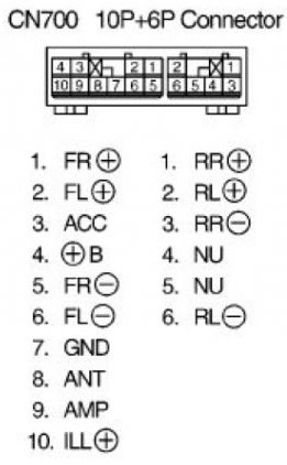Head unit has classic 10P+6P connectors 6P is same as rear boot 10P has wires (color): P01 (light green) = front right speaker (+) P02 (pink) = front left speaker (+) P03 (gray) = ACC power input (+12V switched) P04 (blue-yellow) = BAT power input (+12V constant) fused by "DOME" 15A (underhood last fuse) P05 (blue) = front right speaker (-) P06 (purple) = front left speaker (-) P07 (brown) = GND (-) P08 (empty) = antenna power out P09 (empty) = amplifier power out P10 (green) = illumination input +12V |