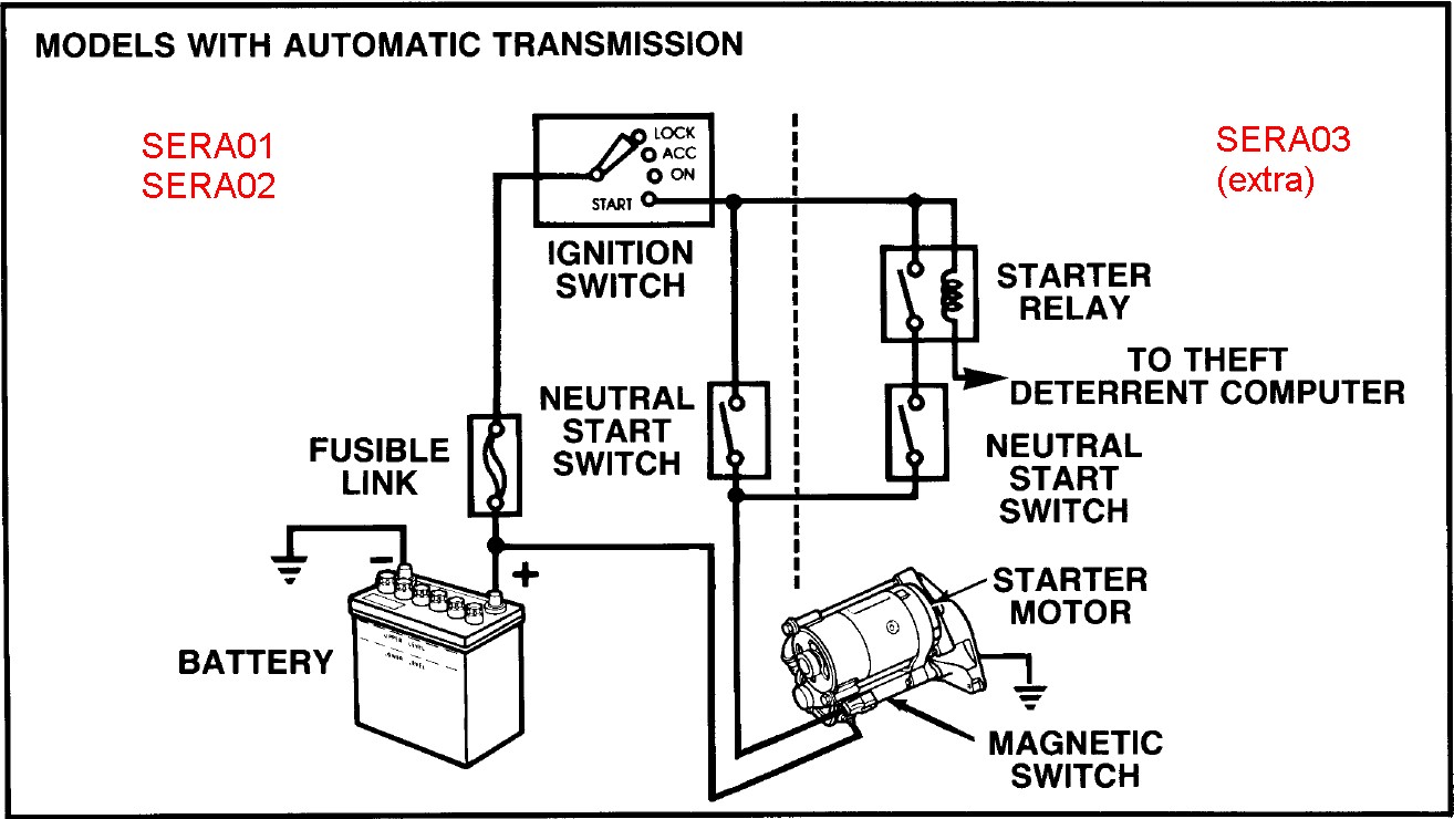 Starter relay is shown on parts scheme 28300 RELAY ASSY, STARTER, but has got no part number for SERA01 SERA02... only SERA03 /28300-10020 (12V Denso 156700-0503) for fuse and relay block /82660-10130 similar relay to check is: 85915 RELAY, MAIN /90987-02006 -> relay has no problem, because I have solenoid sound on each ignition key turn to "start" there is alternative solution to install mentioned relay on SERA01 additional: to clean ground terminals on both engine sides L\R |