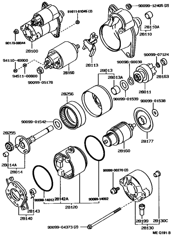 Replaced starter to 28100-11020 (0.8kW) - original for EXY10. was 28100-16230 (0.8kW). starter /28100-10060 fits Sera 1kW Need lower starter bolt /91612-61045 and high load (80A) cord connector (from battery to alternator wire) as specified on fuse box -> this part still needs to be replaced, both wire and terminal measured: Accumulator is 12.29V and above in standby (new battery Varta 5634010613162 "silver dynamic" 63Ah gives 12.6V in installed state, and 12.8V during disconnected from car). Engine starts normally now each time - problem almost solved Real problem of starter was in wiring and oxidized terminals: install more powerful and solid connectors, hide from moist with insulating cover, apply protective paste to battery and lock contact pads as well. clean inside of starter dust see black wire from battery |